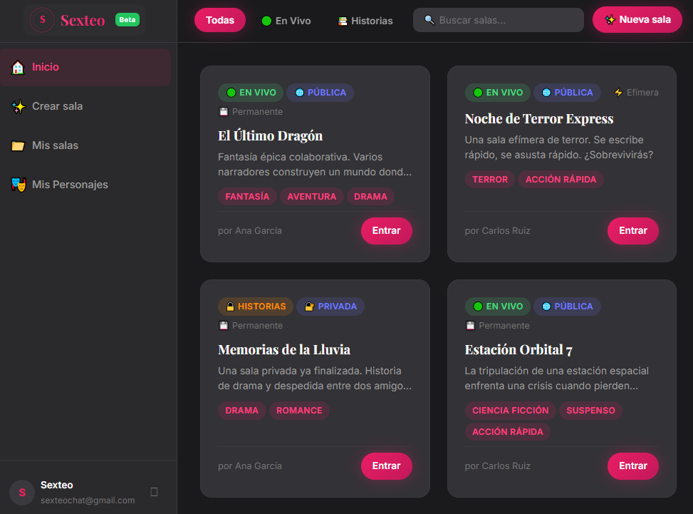 Únete a la beta de Sexteo hoy mismo. Crea tu primera sala, diseña tus personajes y empieza a escribir.